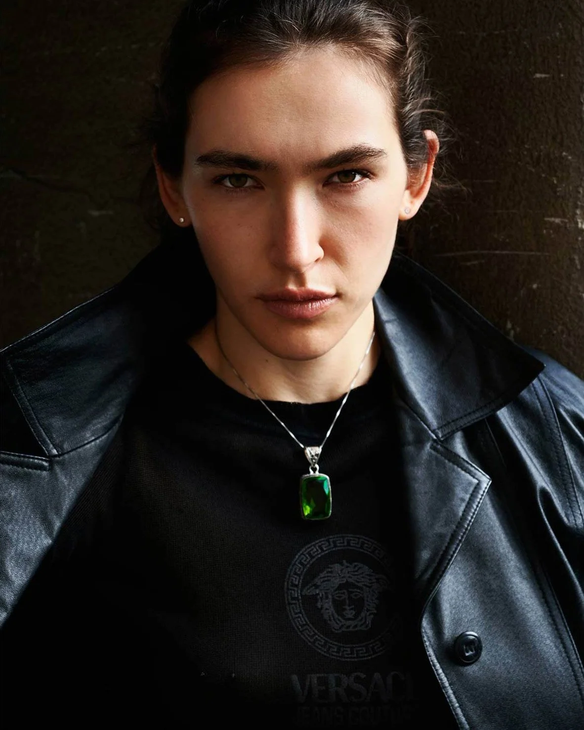 A woman with dark hair wearing a black leather jacket, a black shirt with a Versace logo, and a green gemstone necklace, standing against a dark background.