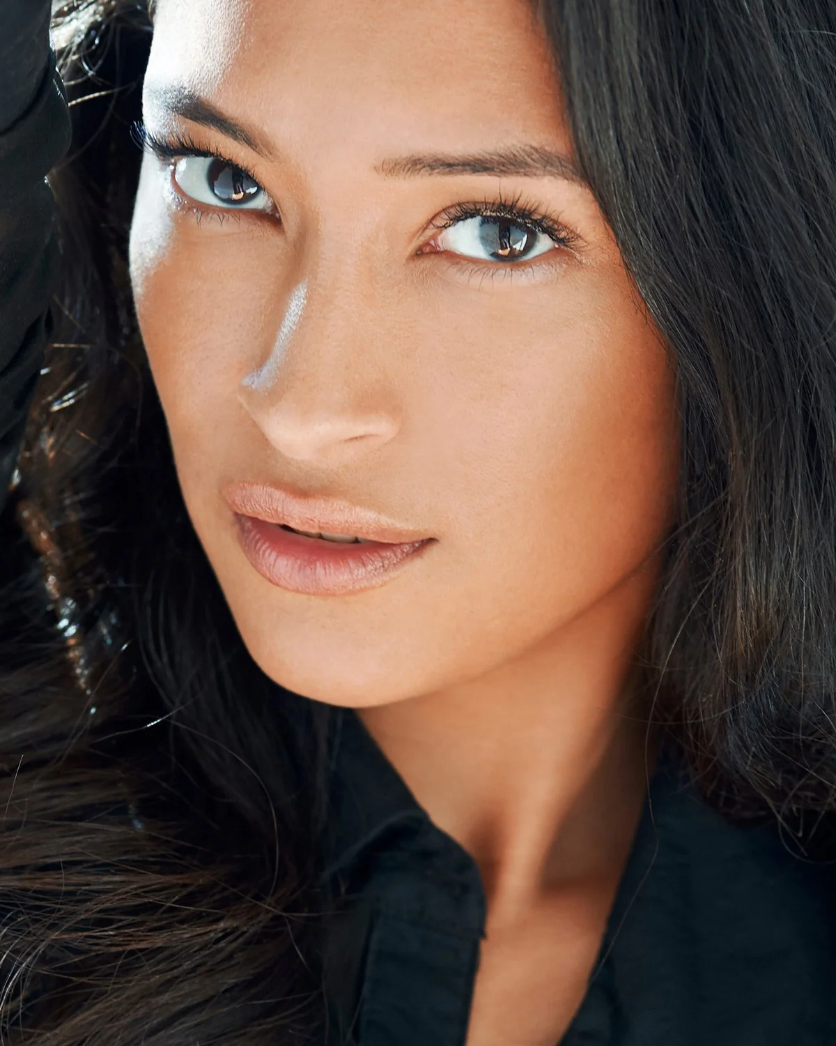 Close-up of a woman with long dark hair, fair skin, and blue eyes, wearing subtle makeup and a black shirt.