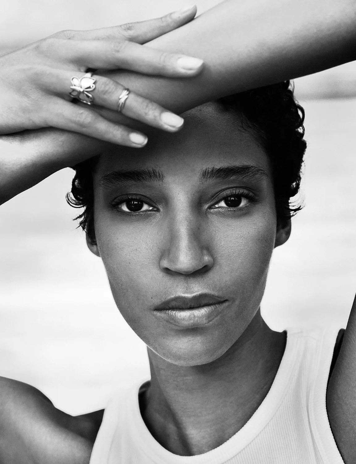 Black and white close-up portrait of a woman with short hair, looking directly at the camera with one hand resting on her forehead.