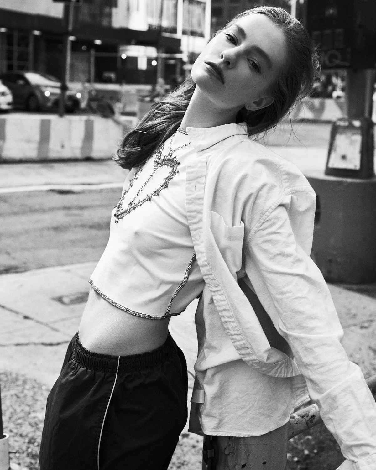 Black and white photo of a young woman with long hair, leaning against a pole on a city street, wearing a light jacket, a crop top, and gloves, with jewelry around her neck, posing with a slight tilt to her head.