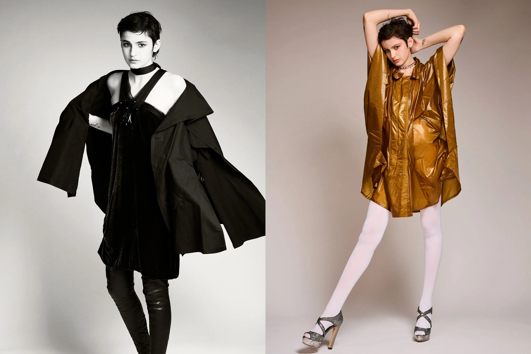 Fashion photoshoot featuring two women, one in black and white with dark clothing and the other in color wearing a metallic gold dress, both posing against a plain background.