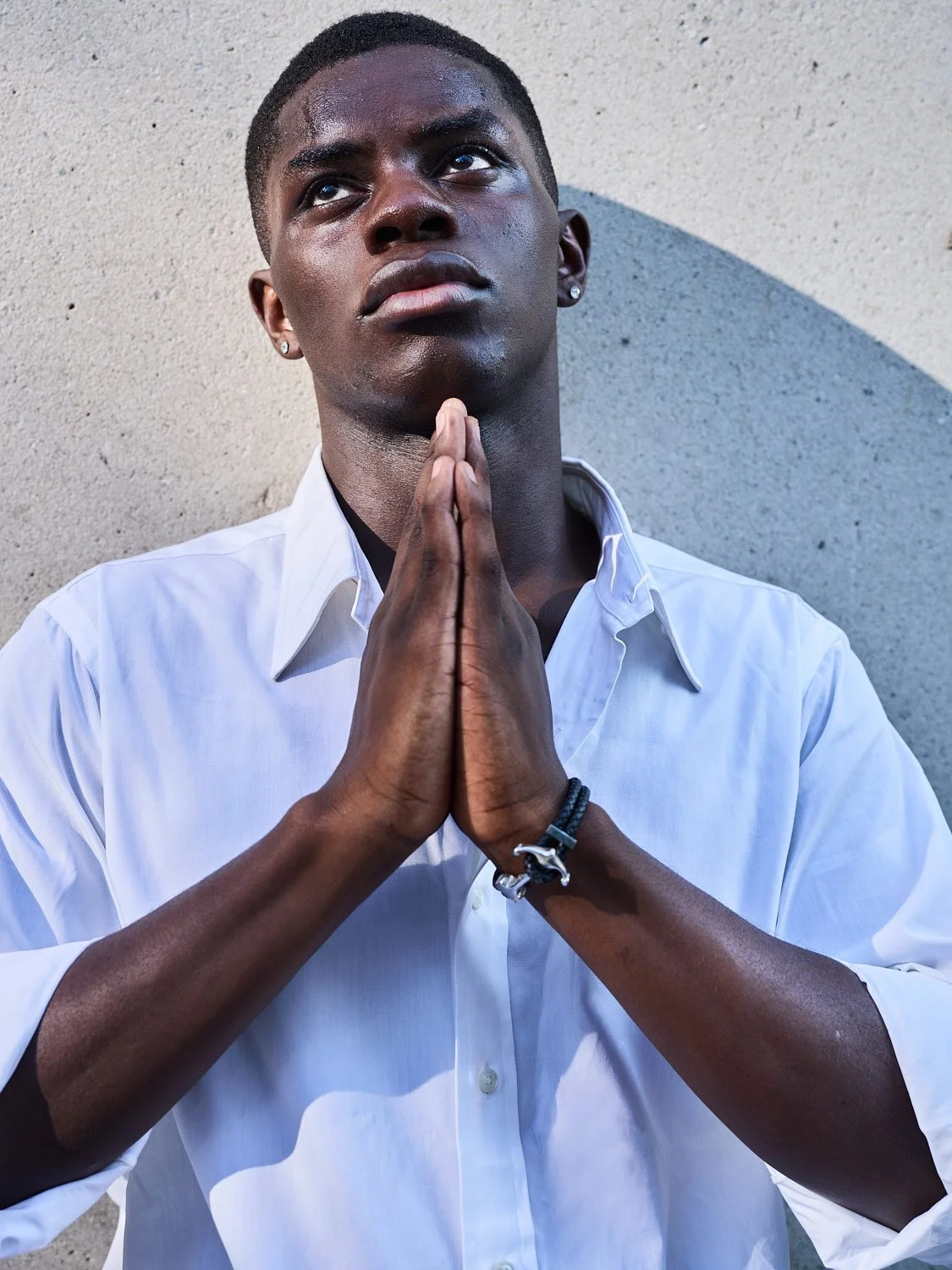 A young man with dark skin and short hair, wearing a white shirt, is standing against a textured wall. He is looking upwards with his hands pressed together in a prayer or contemplative pose.