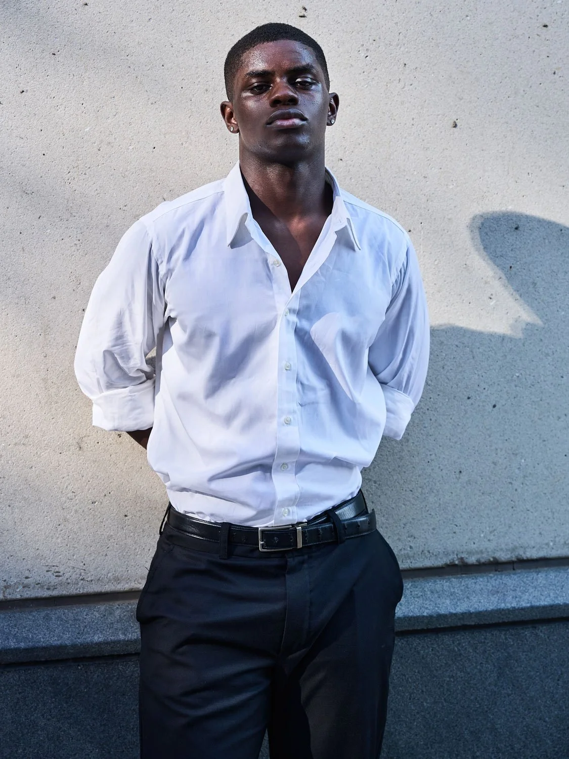 A young man in a white button-up shirt with rolled-up sleeves, black pants, and a belt, standing against a plain concrete wall, with his hands behind his back and a serious facial expression.