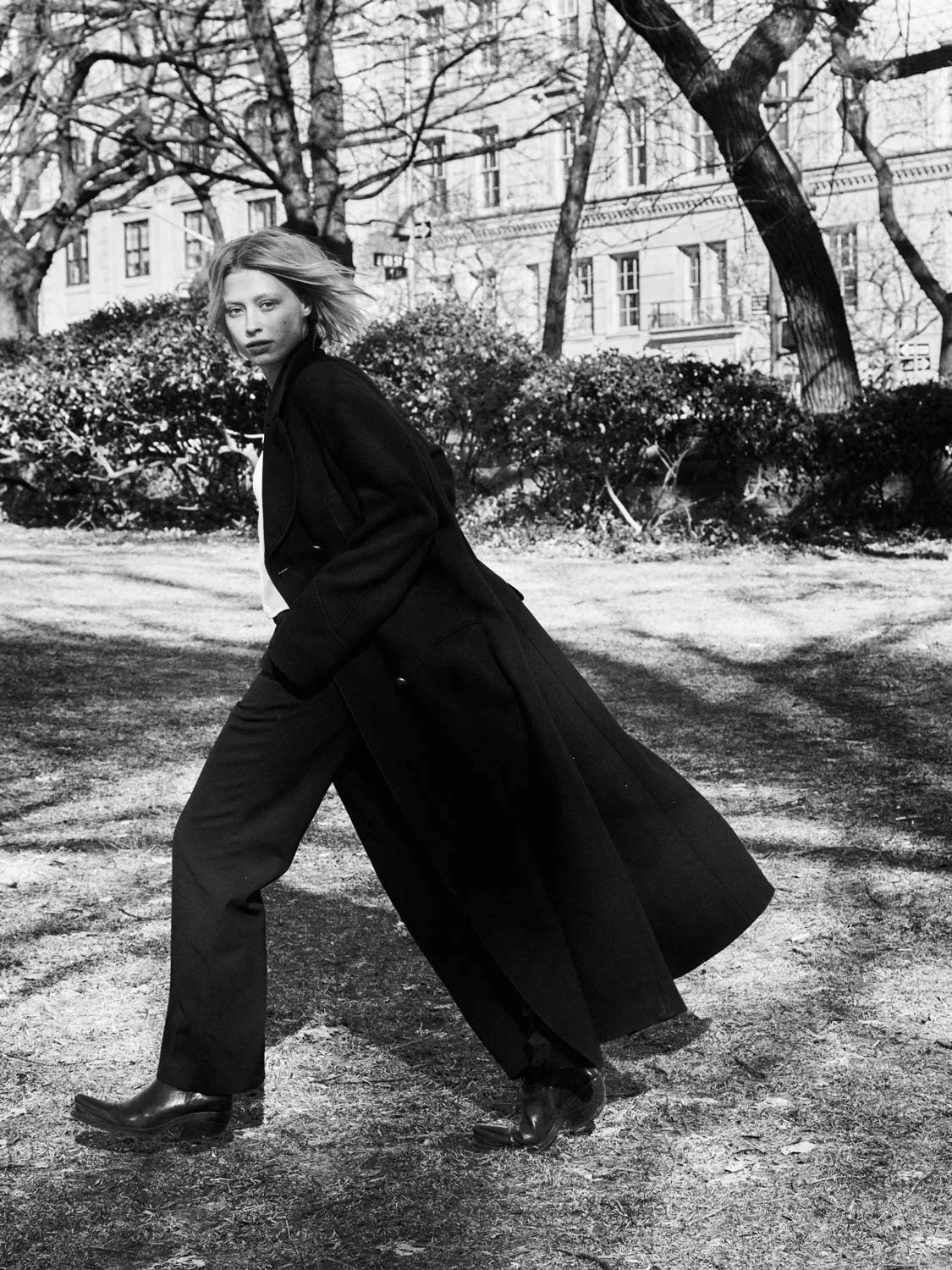 A woman with short, blonde hair wearing a long black coat, dark pants, and black boots, standing outdoors on a dirt path with leafless trees and a building in the background.
